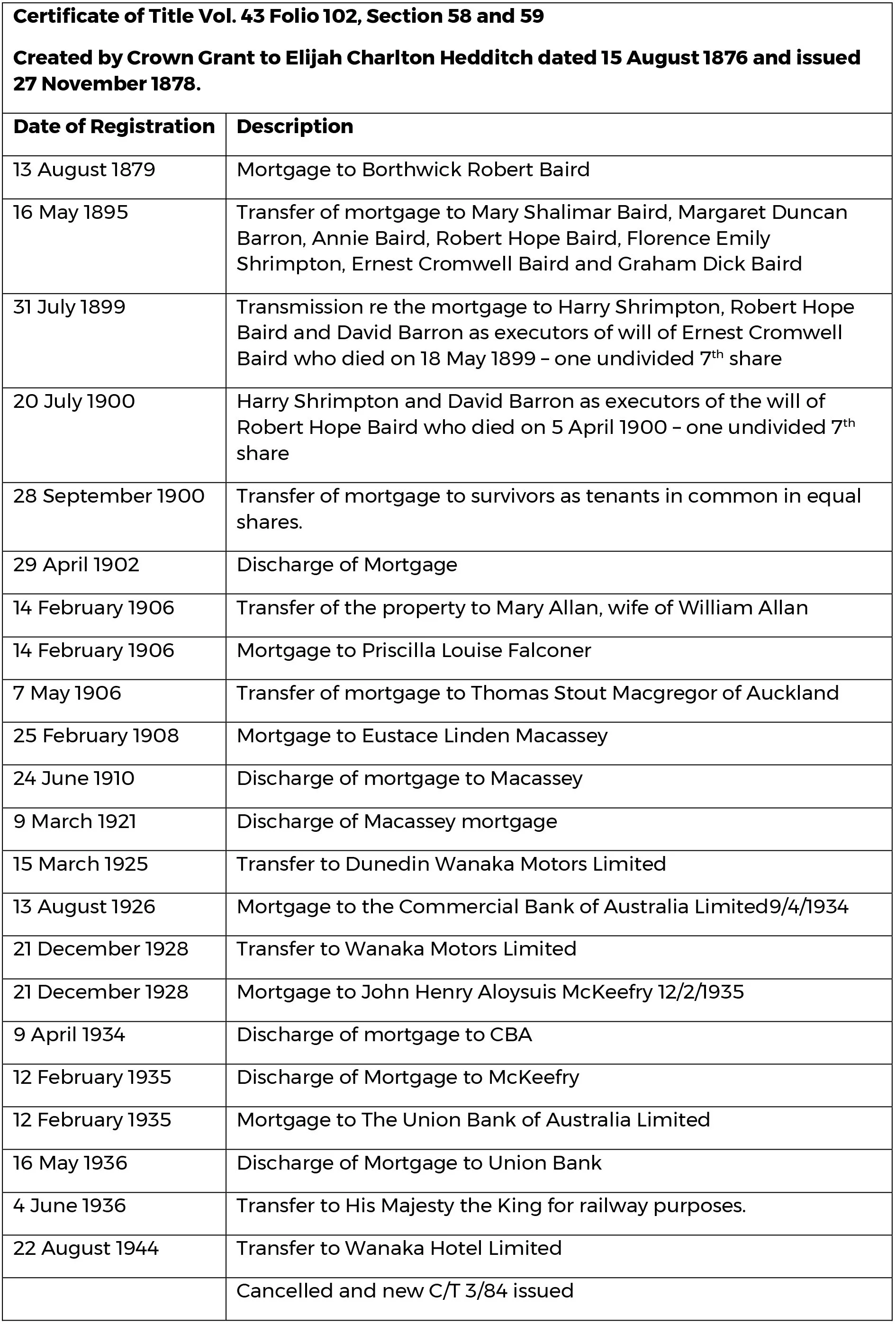 [1] Transfer was not registered until 1906 but Otago Witness reported that in 1904, William Allan started to shift his house onto the property – lake Wanaka, Otago Witness, 5 October 1904, page 35.